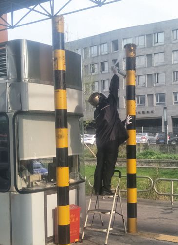 圖為工作人員用殺蟲劑噴射蜜蜂 當(dāng)班副班長何丹燕立即將車道內(nèi)情況報(bào)告給所領(lǐng)導(dǎo),副所長何先林聽聞后急急披上雨衣,戴上頭盔和手套,迅速趕到車道,經(jīng)過簡單防護(hù)的他用殺蟲劑噴射蜜蜂集聚的位置。與此同時,何丹燕疏導(dǎo)后方車輛從其他車道通行。