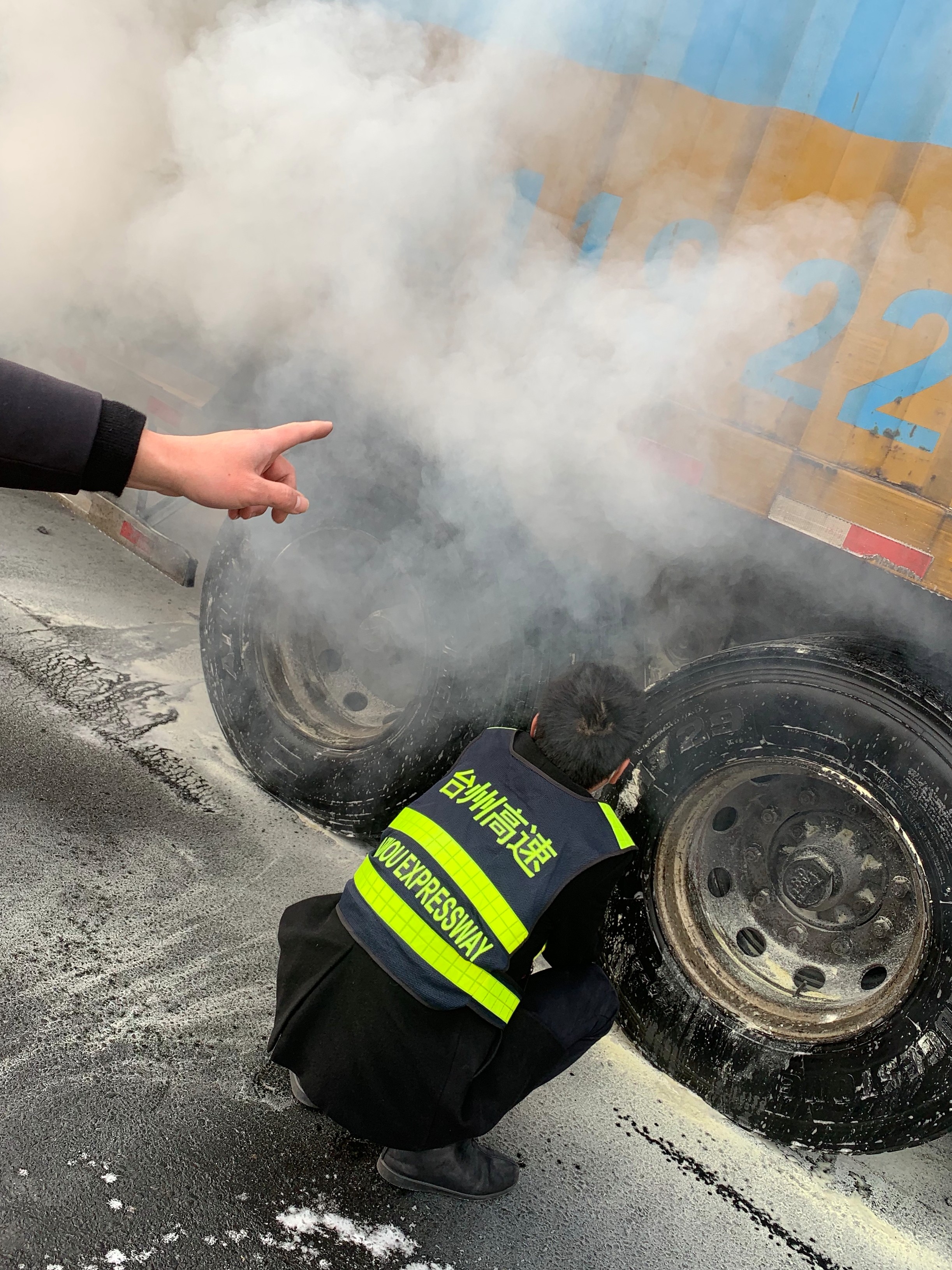 “嘭……”3月5日早上7:35分左右,臺州收費所傳來一聲巨響,一輛車牌“閩”字開頭的大貨車緩緩駛來,其車廂后輪胎正冒火光,隨之白煙滾滾升起,駕駛員卻渾然不知,一路行駛。
