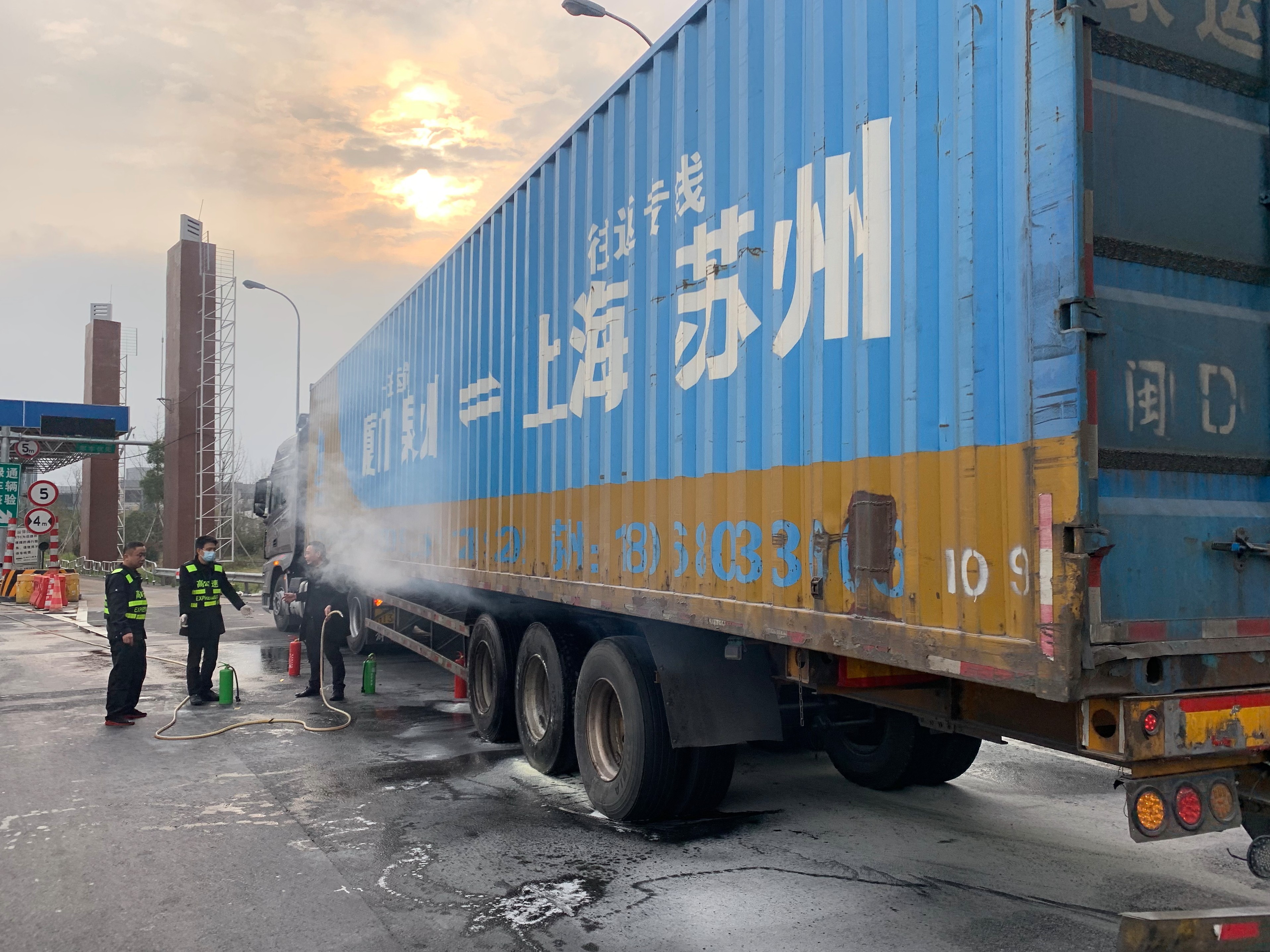 “停車,停車,輪胎起火了?!笔召M員盧靜對著貨車不停搖手,喊話,貨車駕駛員這才發(fā)現(xiàn)情況,在內(nèi)廣場附近停下來。 時間就是生命,時間就是速度,當班班長張錚,副班長黃智超和收費員鐘鴻廣第一時間拿起崗亭外的滅火器奔向起火車輛。大家齊心協(xié)力,火苗瞬間被壓了下去。