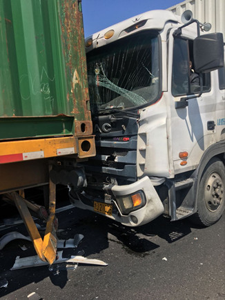 上圖為事故車輛 當天中午,在副站崗亭旁站的工作人員發(fā)現(xiàn)該所前方出口不遠處有貨車停在那里不動,以致后面車輛無法通行。工作人員隨即跑到前方查看情況,原來是三輛貨車發(fā)生追尾,其中有一輛車車頭被撞得凹陷,擋風玻璃也被撞碎,在了解事故現(xiàn)場無人員受傷后,工作人員馬上向監(jiān)控中心匯報情況。由于事故車輛較大面積滯留,導致后方車子堵到主線上,一些不明情況的駕駛員在車里使勁按喇叭催促,現(xiàn)場充滿焦躁情緒。 如何盡快疏通道路?正在食堂吃飯的一班班長潘慶耀放下碗筷跑到事故現(xiàn)場,同工作人員叫前面受損較少的事故車輛先把車子開出收費站,再讓第三輛受損嚴重的車子試著發(fā)動車子開出去,所幸三輛車子都能開離車道。在將地上的破損碎片清理到車道兩旁后,工作人員繼續(xù)指揮車輛向前行駛,收費內(nèi)廣場在較短時間內(nèi)恢復了正常通行。 沈芬芳