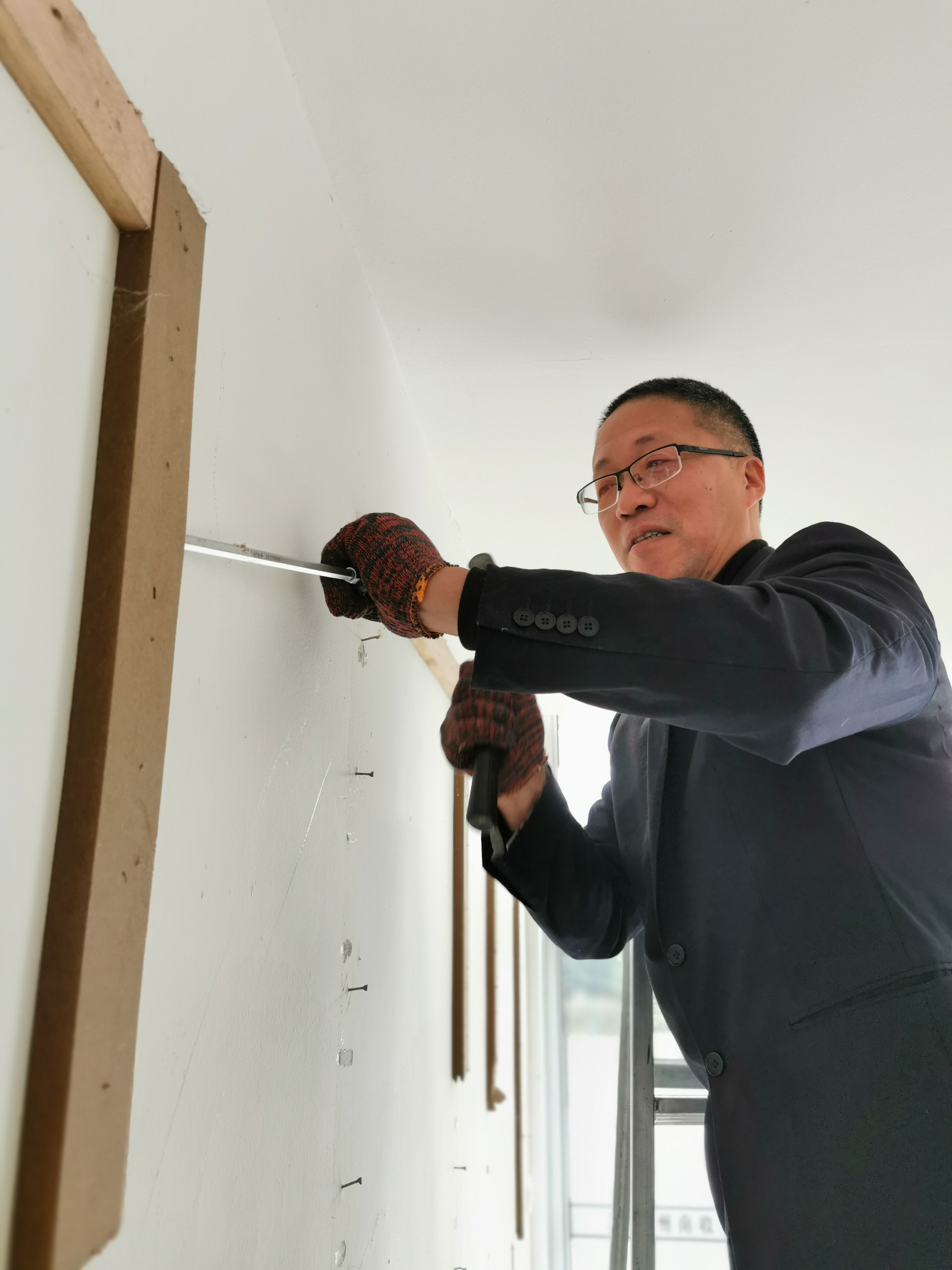 圖為金曉斌正在拆除舊的黨建介紹版
