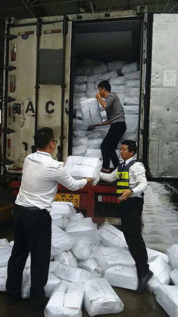 圖為工作人員幫忙搬運掉落的貨物 這輛滿載海鮮的綠農車,貨物掉滿車道,司機一人束手無策,當班班長陳豐平在拍完綠農照片后,叫上班員林葉輝,一起快速幫助司機一件一件地傳遞貨物。盡管每一袋貨物都十分重,但是他們?yōu)榱藥椭鷰煾堤嵩缯碡浳?,顧不得臉上交織的汗水和雨水?/span> 由于工作人員的幫助,司機離開時一直道謝。他們對司乘人員的主動援助,使得溫嶺西收費所的服務不單單停留在窗口問候上,還將延伸服務一直呈現(xiàn)。 陳豐平