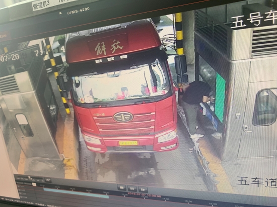 圖為失主遺落錢財現(xiàn)場 當天上午,收費班長李寧巡查時在第五車道窗口附近發(fā)現(xiàn)了三百元現(xiàn)金,經多方確定不是所內工作人員遺失后,判斷為過往司機不小心遺失。為了盡快找到失主,李寧隨即去監(jiān)控室調取視頻查找。 經過監(jiān)控查找,馬上鎖定了一輛車牌為“豫”字開頭的大貨車。原來當時因駕駛室距離窗口較遠,司機下車付錢,監(jiān)控中清晰顯示司機在掏錢繳費時三百塊現(xiàn)金從口袋里掉到車道上,但是司機因為趕路絲毫沒有發(fā)覺。確認失主后,工作人員查詢司機電話并取得聯(lián)系,告知其遺失三百現(xiàn)金,在通過微信確認身份后,李寧將錢轉給了司機。
