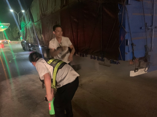 圖為收費員協(xié)助司機滅火 當(dāng)時,正值收費員林王鍵負(fù)責(zé)高速入口的安全工作。他在巡查自助發(fā)卡機時發(fā)現(xiàn)入口處一輛貨車突然起火,隨之冒起了大片煙霧,并伴隨著刺鼻的氣味。林王鍵見狀立馬拎起身邊的滅火器就向貨車跑去,并且向班長報告。在工作人員和司機齊心協(xié)力撲救下,大火十幾分鐘就被撲滅了。經(jīng)過檢查,起火的原因是因為貨車剎車突然抱死,摩擦起火。所幸大火并未造人人員傷亡和財產(chǎn)損失。 大火撲滅后,司機連連道謝,如果不是大家?guī)兔皶r撲滅,后果不堪設(shè)想,他為工作人員這種奮不顧身的精神點贊。 在此,提醒各位司機,車輛上一定要配備滅火器等急救設(shè)備,特別在炎熱的夏天,是車輛起火的多發(fā)時期,配備滅火器可以有效控制火災(zāi),減少損失。 楊相暖
