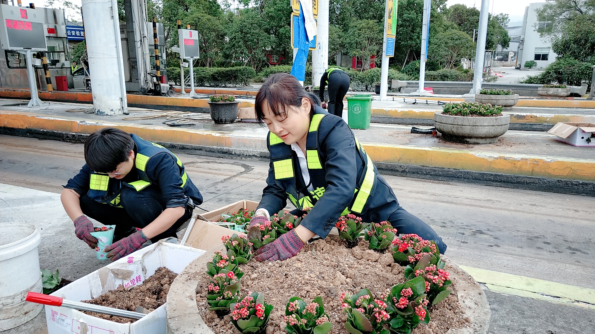 圖為栽種現(xiàn)場 現(xiàn)場,志愿者們身穿反光背心,拿著鋤頭、鐵鍬、水桶,帶著事先買來的小花苗,來到收費(fèi)區(qū)域的島頭開始栽花活動(dòng)。所領(lǐng)導(dǎo)班子成員身體力行,帶領(lǐng)大家投入到緊張的勞動(dòng)中。大家挽起衣袖,不怕臟、不怕累,有的松土、有的種花、有的填土,有的澆水……有序地將一棵棵花苗栽進(jìn)土壤。 通過大家的共同努力,經(jīng)過近4個(gè)小時(shí)的時(shí)間,400棵樹苗被栽進(jìn)了20多個(gè)大花盆中,美化了整個(gè)車道環(huán)境。 此次栽花活動(dòng)增強(qiáng)了大家的生態(tài)環(huán)保意識(shí)和綠化意識(shí),大家紛紛表示添花更要護(hù)花,要將綠化活動(dòng)意識(shí)長期付諸實(shí)踐,共同建設(shè)美麗溫嶺西收費(fèi)站。 鄭霞霞