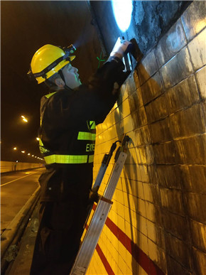 中心工作人員在管理現(xiàn)場安全的同時,主要負(fù)責(zé)修復(fù)隧道內(nèi)損壞的逃生標(biāo)志牌、報警電話指示燈、攝像頭等機(jī)電設(shè)備。
