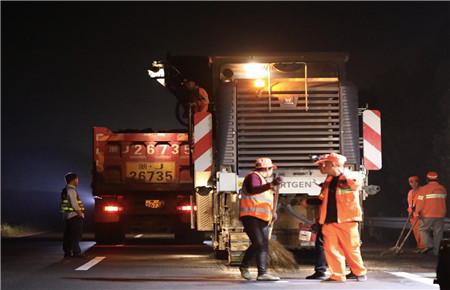 確定日期時間。施工前夕工程部負責人反復與交警、路政等部門溝通協(xié)調(diào),渠道暢通,最終達成一致意見,為盡量避免給公眾出行帶來影響,施工基本采用夜間斷流封道方式進行。施工過程中與高速交警、路政配合默契,封道都在規(guī)定時間內(nèi)開始結束,盡所能減輕施工對高速營運影響,保證路段通行能力。