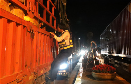 夜間綠農(nóng)車輛多,據(jù)統(tǒng)計,當天凌晨早班臨海南收費所出口綠農(nóng)車108輛,是平時日均數(shù)量的八九倍。短時間內(nèi)的“井噴式”增長,這又是一個大考驗?!叭柧G色”、“一號綠色”、“二號綠色”……“來啦!”旁站人員箭步?jīng)_過去拍照取證、檢查車輛。大貨車又高又寬,平時需登專用扶梯進行檢查,可在大流量面前保安全省時間是第一要旨,這些個巾幗女將們面對高貨車,一手拉著車把,一腳踩在車杠上,迅速上車開展核查,執(zhí)行速度絲毫不遜于男同志。有時剛從這輛貨車上下來,又立刻奔向了其它車道。晴夜當空,車道間一個個忙碌的身影不停穿梭著,卻不言乏力。