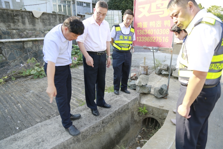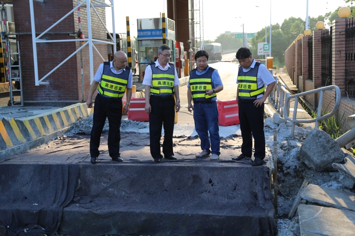 圖為陳文波檢查臺州收費(fèi)站內(nèi)廣場隔離墻