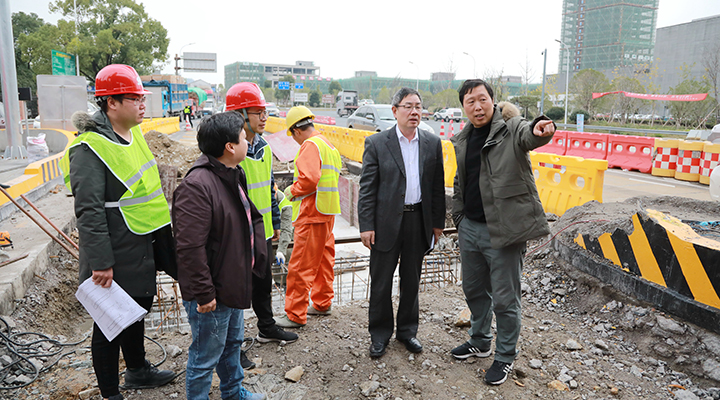 圖為陳文波在收費(fèi)所混合車道施工現(xiàn)場(chǎng)了解施工進(jìn)展情況