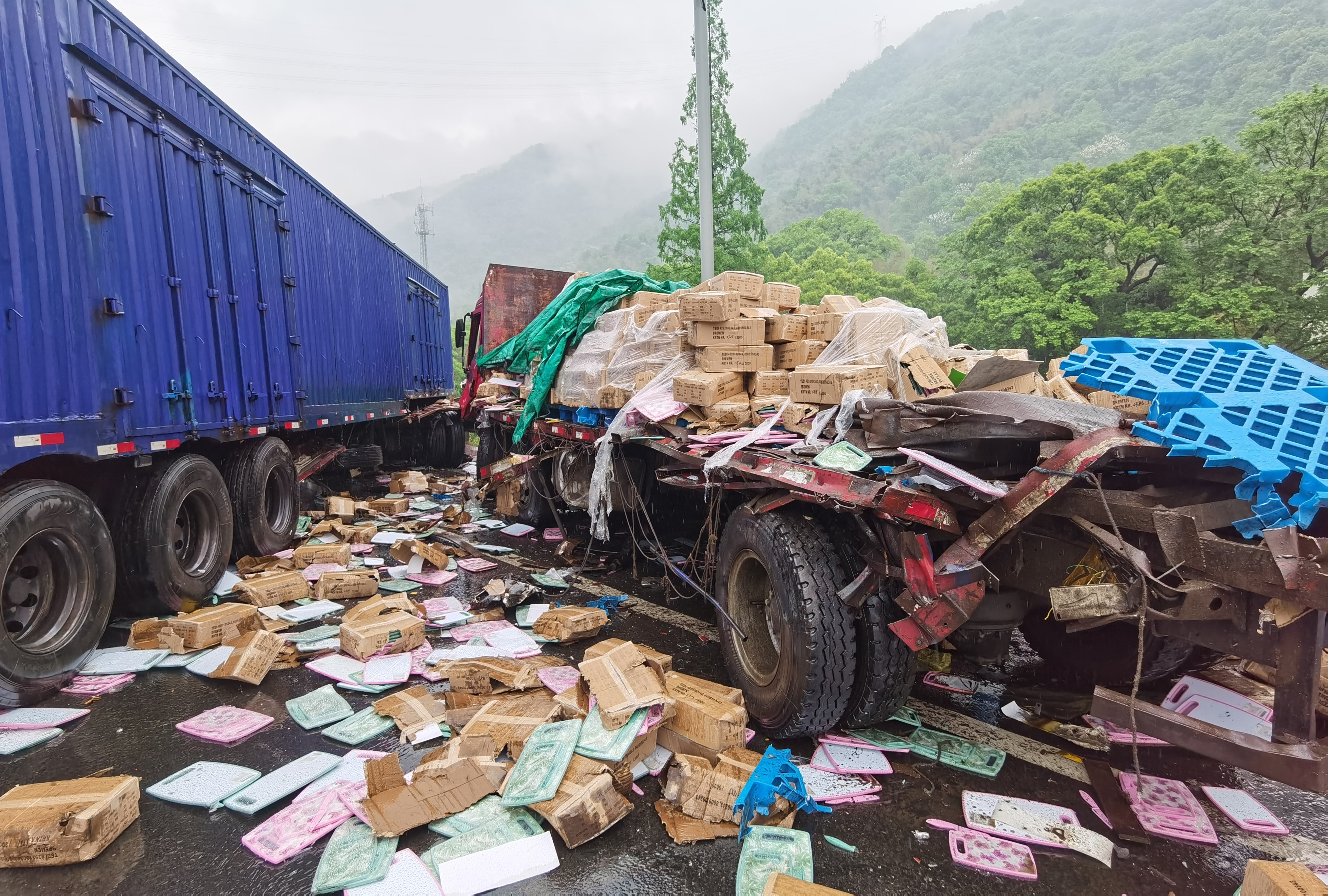 緊急救援!黃土嶺隧道口一輛大貨車避讓不及追尾后撞上護(hù)欄 4月13日上午8點(diǎn)30分左右,天突下大雨,黃土嶺隧道附近傳出一聲巨響,發(fā)生了驚魂一幕。 距離寧向洞口200米處,有一輛14米長的箱式大貨車避讓不及撞上了一輛平板小貨車,隨即又撞到隔離護(hù)欄,整個(gè)車頭瞬間被撞得七零八碎嚴(yán)重變形,車尾橫向路面且僅留小車能駕駛的空間。被追尾的平板貨車所載貨品散落一地,高速路上、護(hù)欄外一片狼藉,所幸無人員傷亡,大貨車司機(jī)膝蓋輕微撞傷。
