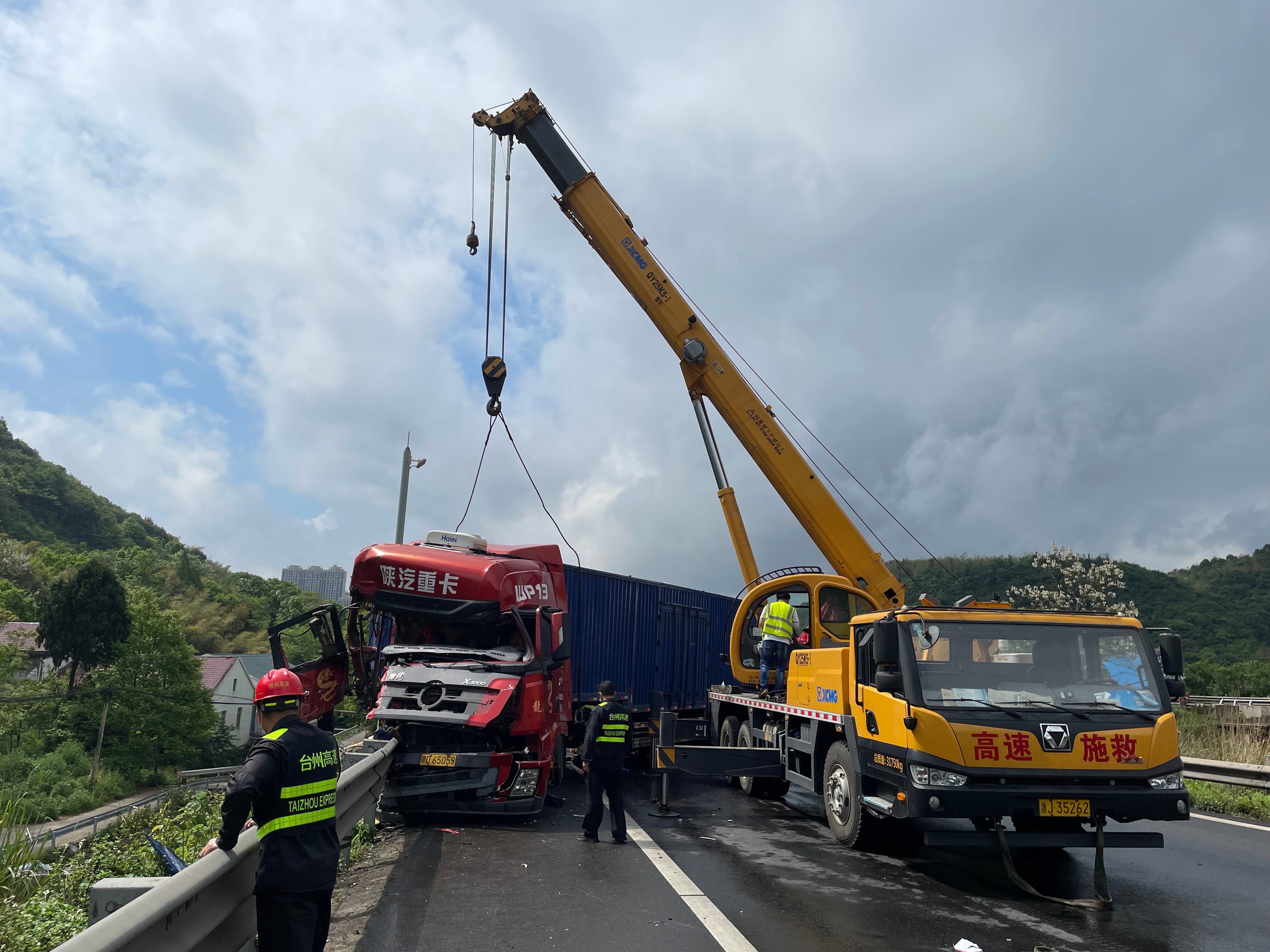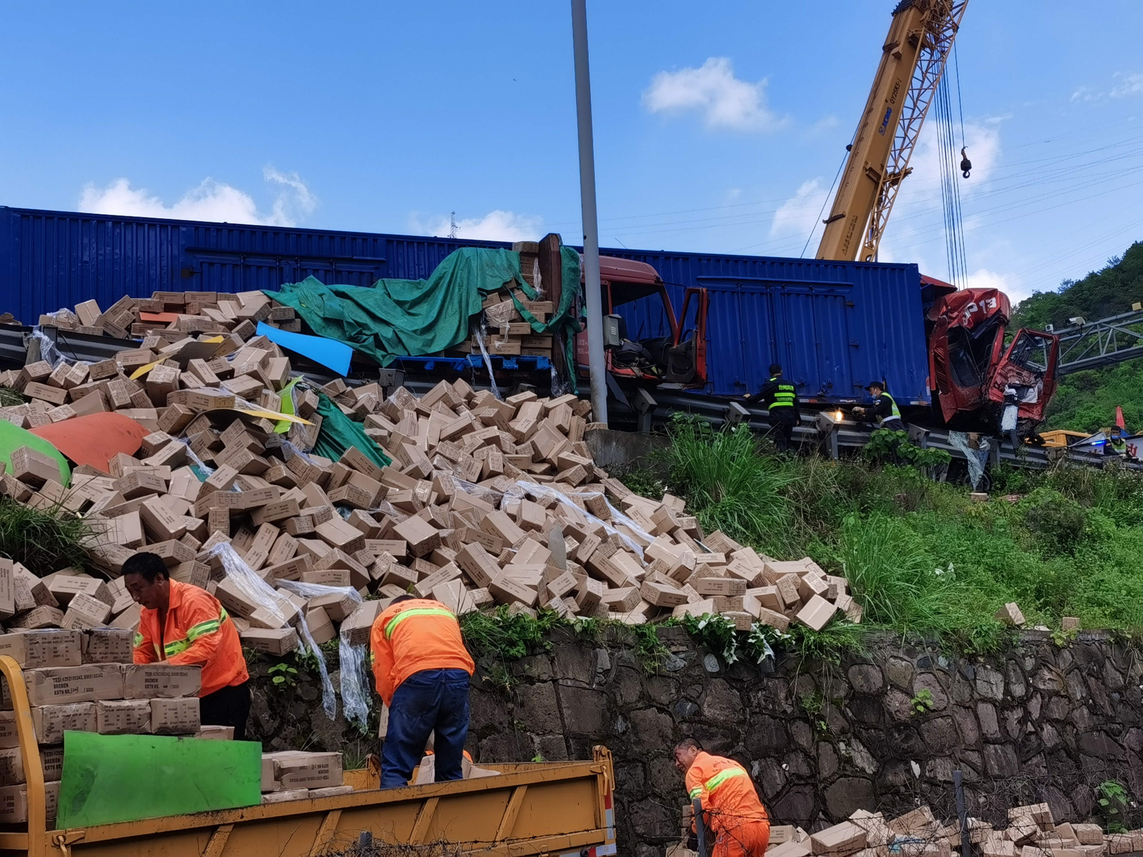 隨后,拖車、救護(hù)車、吊車相繼到達(dá),所有人員立即有序分工,因大貨車車頭卡在護(hù)欄,需要切割,拖車難度較大需要吊車將其拖出,現(xiàn)場(chǎng)救援緊急開展。隧道所工作人員協(xié)助駁貨車清理貨物和散落的車架,保證高速路面通暢。 后經(jīng)詢問了解,平板貨車因車輛拋錨停在黃土嶺寧向洞口200米處,雖然已將安全警示牌放在車輛后方,但車輛未完全??窟吷?。后方一輛箱式貨車發(fā)現(xiàn)時(shí)緊急剎車,由于當(dāng)時(shí)正下大雨路面濕滑,緊急制動(dòng)后車輛發(fā)生擺尾失控,司機(jī)急打方向想要救車阻止,但是依然撞上了前方的拋錨貨車。 再次提醒廣大司乘人員,雨天路滑,要控制車速保持車距離,遇車輛拋錨,車靠邊人撤離,并撥打高速救援電話12122。 蔣弓