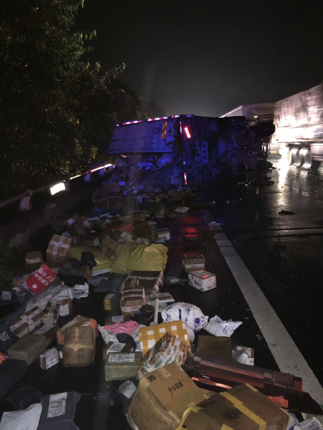 7月14日凌晨1點,溫州方向臺州南收費所附近,一輛半掛型大貨車和一輛快遞車相撞,半掛車直接沖出高速,四腳朝天??爝f車則是被巨大的沖擊力撞向了硬路肩,側翻中撒下數(shù)十米的貨物。1點10分,救援車輛到達現(xiàn)場,現(xiàn)場一片狼藉,防撞護欄板、護欄柱損傷嚴重,橋梁鋼管都折斷了不少。