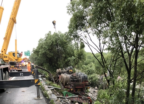 7月15日上午,臺州高速集團施救中心輔查員和駕駛員在核對路產(chǎn)損失。這是他們第三次到事故現(xiàn)場進行路產(chǎn)勘查。