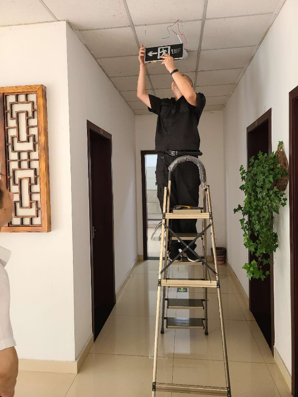 圖為技術人員安裝現(xiàn)場 在得知這一情況后,維養(yǎng)中心積極協(xié)助收費站所購買相關的主材及配件,并主動承擔了這些設備安裝工作。由于設備安裝位置很多沒有直接可用電源,中心技術員們就從四五米外甚至更遠的地方,一路套管放線過來取電,并用電錘等工具為其開孔固定,最后再完成接線送電。經(jīng)過2天努力,這些帶有方向提示標識、安全出口標識的燈牌被安裝在各層樓梯出口、拐角或主要通道上,因全部帶有儲電功能,即便在斷電的情況下也能發(fā)光發(fā)亮。