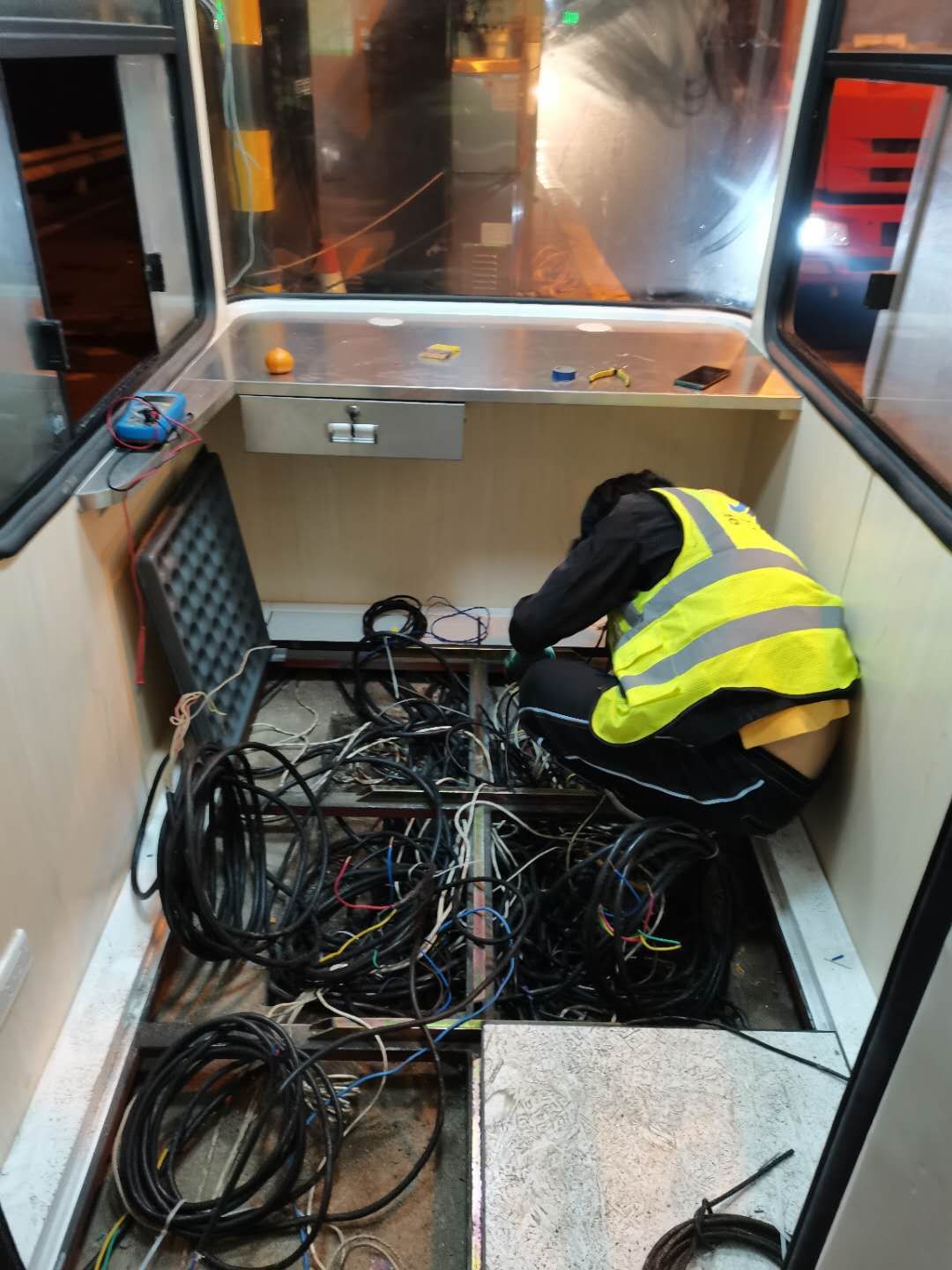 21日下午4點(diǎn)左右,訂購的新崗?fù)ず蛽p壞的設(shè)備設(shè)施陸續(xù)到位,中心值班人員協(xié)同設(shè)備廠家一起將其安放并固定至車道原位置。因崗?fù)A倒時拉斷了底下很多線纜,在拆除設(shè)備時又因?yàn)榫o急搶修需要沒有作相應(yīng)標(biāo)注,現(xiàn)場各種電線接頭雜亂如麻。考慮到夜間查線、接線存在一定的安全隱患,也不利于施工,搶修人員決定第二天再戰(zhàn)。