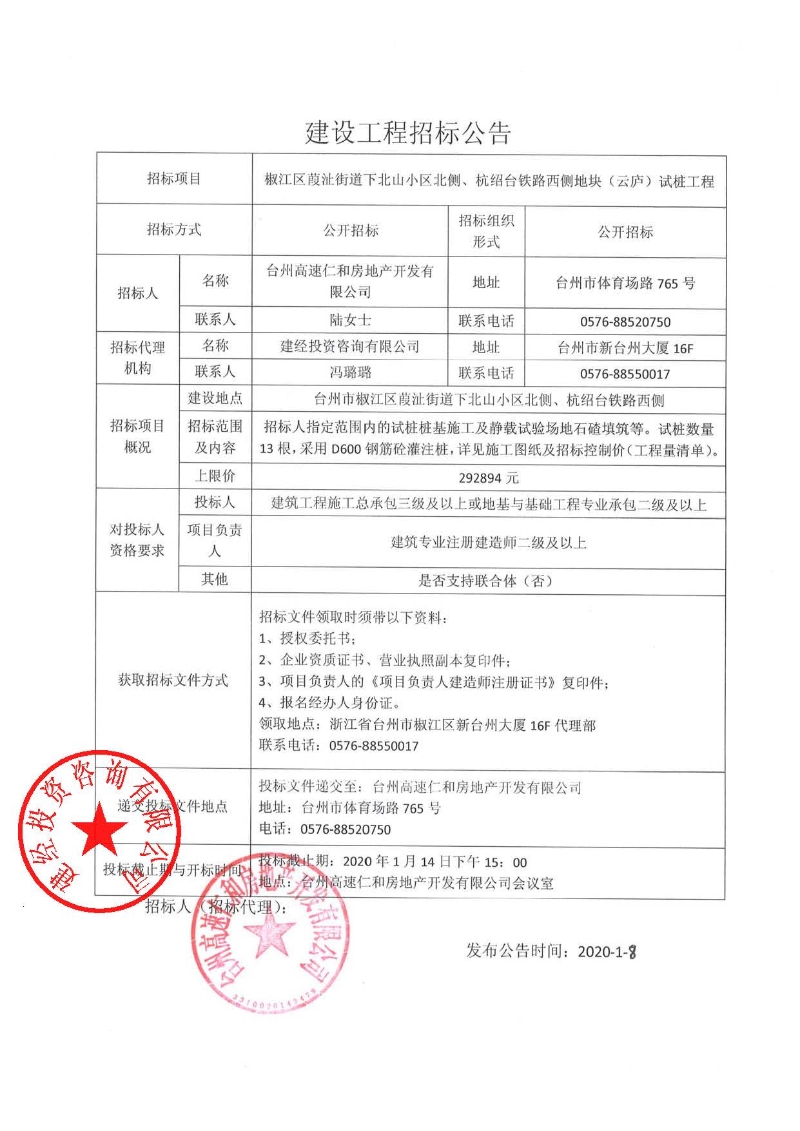 椒江區(qū)葭沚街道下北山小區(qū)北側(cè)、杭紹臺(tái)鐵路西側(cè)地塊(云廬)試樁工程招標(biāo)公告