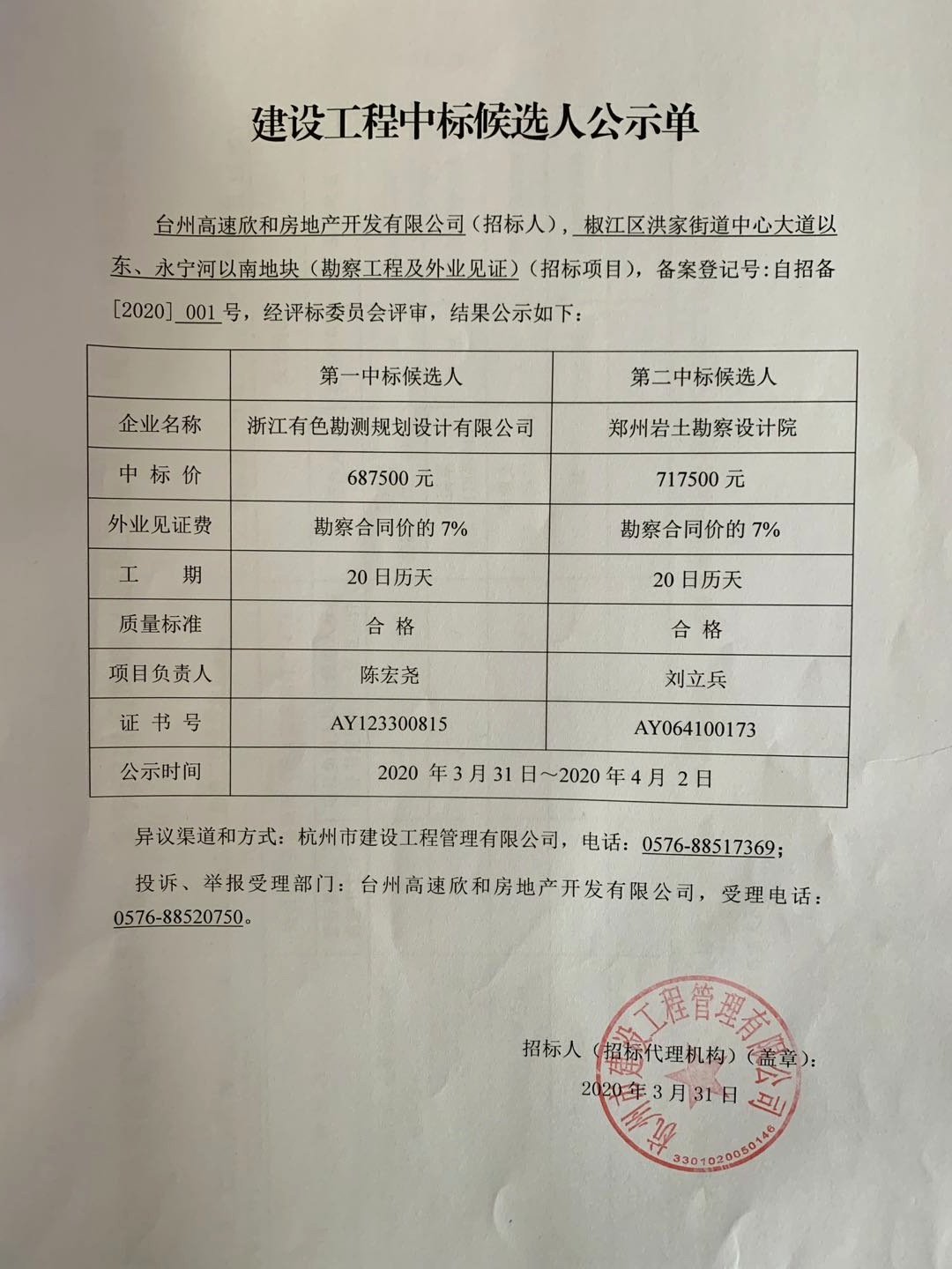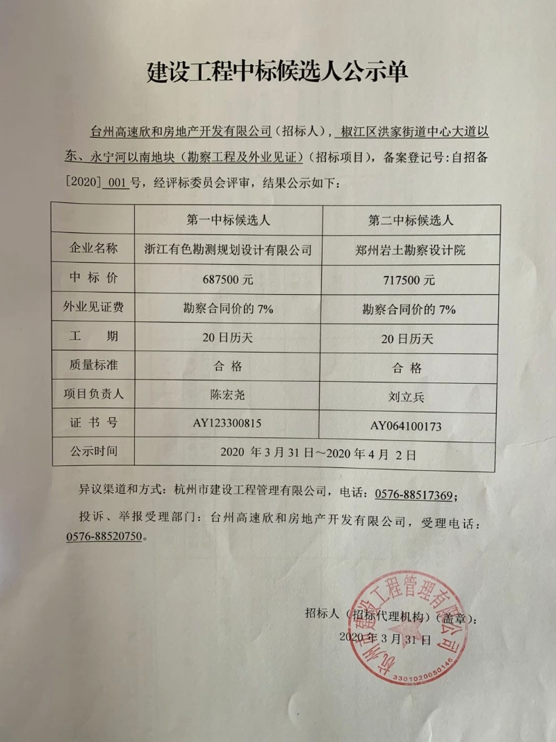 椒江區(qū)洪家街道中心大道以東、永寧河以南地塊(勘察工程及外業(yè)見證)(招標(biāo)項(xiàng)目)中標(biāo)候選人公示單