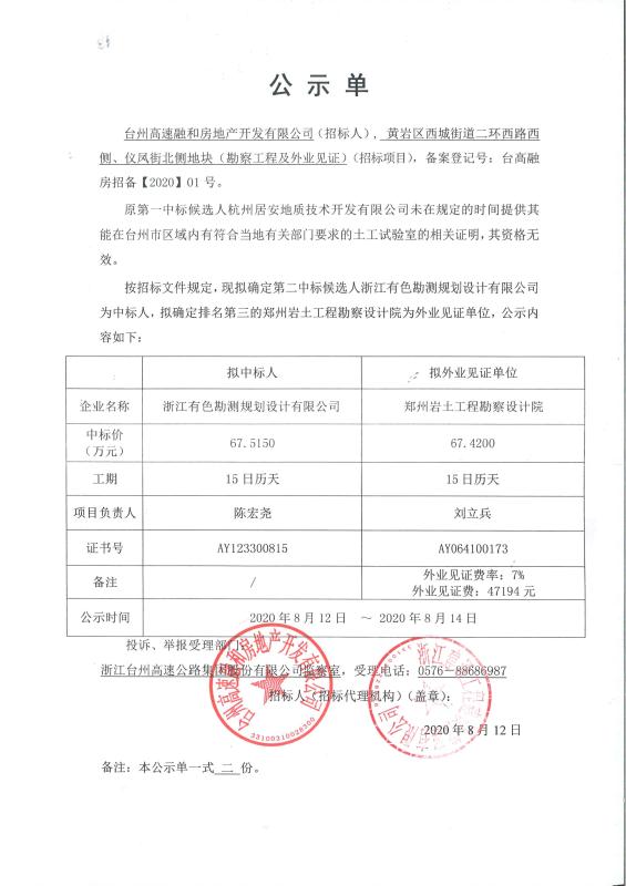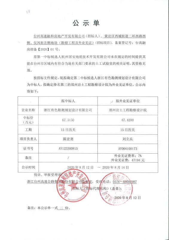 黃巖二環(huán)西路西側(cè)、儀風(fēng)街北側(cè)地塊(勘察工程及外業(yè)見證)中標(biāo)公示