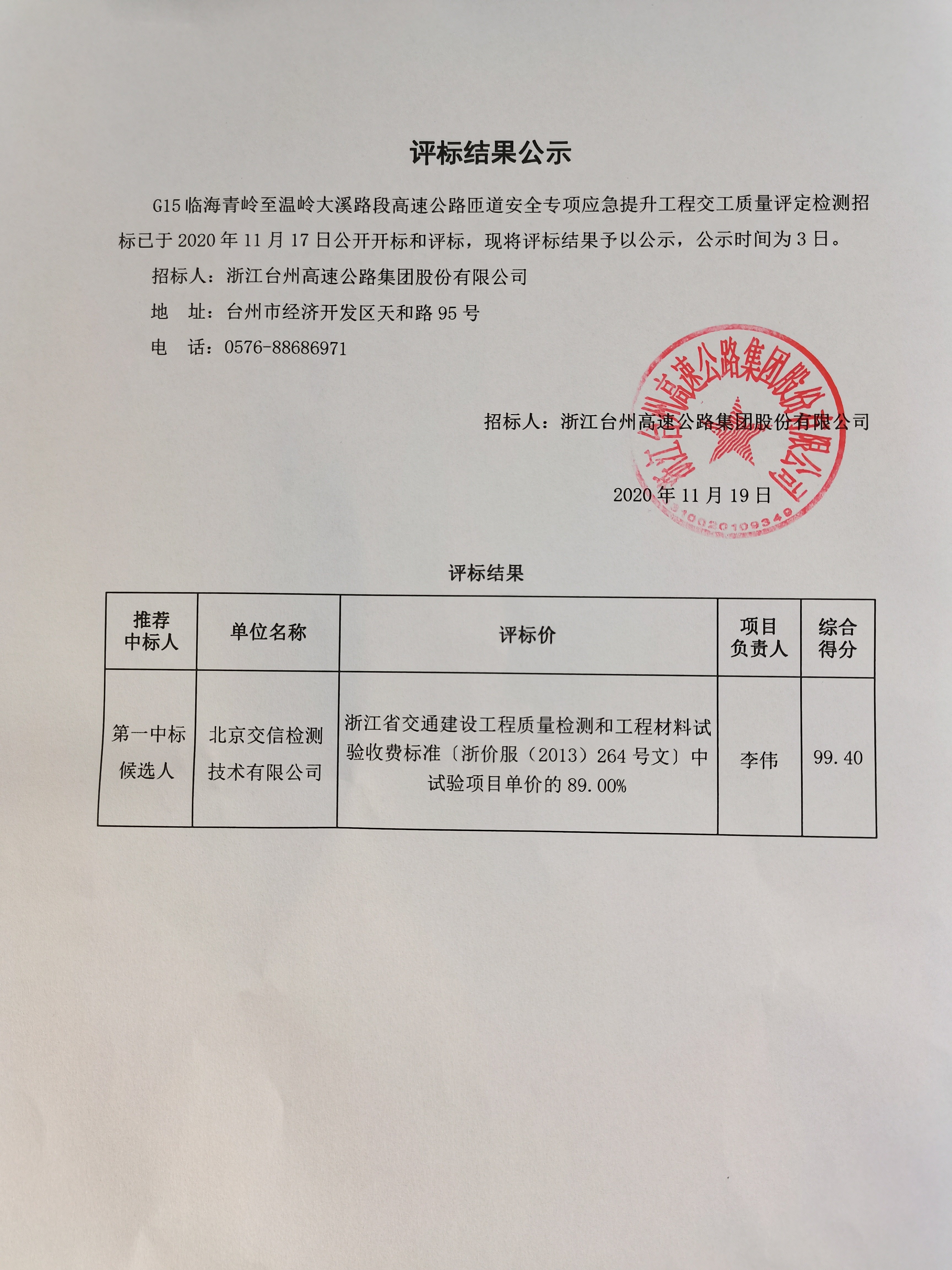 G15臨海青嶺至溫嶺大溪路段高速公路匝道安全專項(xiàng)應(yīng)急提升工程交工質(zhì)量評(píng)定檢測(cè)招標(biāo)評(píng)標(biāo)結(jié)果公示