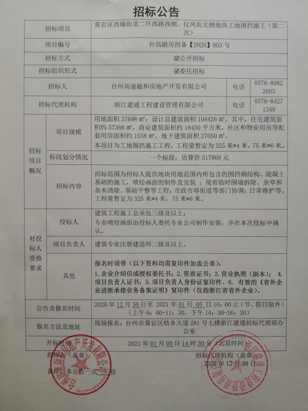 黃巖區(qū)西城街道二環(huán)西路西側(cè)、儀風街北側(cè)地塊工地圍擋施工(第二次)招標公告
