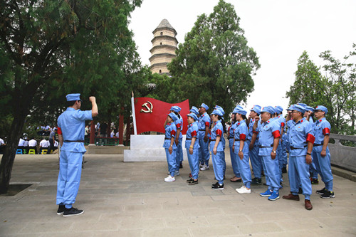 圖為黨員在梁家河合影 不顧前一天的舟車(chē)勞頓,第二天一大早,黨員們整裝出發(fā),在紅色旗幟引領(lǐng)下,頂著烈日,一路步行到達(dá)寶塔山山頂。“手抓黃土我不放,緊緊兒貼在心窩上。幾回回夢(mèng)里回延安,雙手摟定寶塔山?!本C合支部的小周對(duì)著寶塔山,情不自禁地大聲誦讀起賀敬之的《回延安》。黨員們?cè)谖∥毸赂吲e右拳,用鏗鏘有力的聲音宣讀了入黨誓詞,對(duì)于大家來(lái)說(shuō),重溫入黨誓詞是共產(chǎn)黨員表達(dá)自己為共產(chǎn)主義奮斗終生的最佳方式,黨員們的心靈再次受到震撼和洗禮。