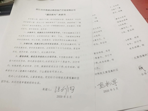圖為全體黨員觀看廉政教育短視頻《國畫》  圖為簽訂“廉潔家風(fēng)”承諾書 根據(jù)集團公司《關(guān)于組織開展“廉政教育月”活動的通知》文件要求,為推動“不忘初心、牢記使命”主題教育常態(tài)化,深入學(xué)習(xí)貫徹黨的十九大和十九屆二中、三中、四中全會及十九屆中紀(jì)委四次全會精神,嚴(yán)守黨的政治紀(jì)律和政治規(guī)矩,更好地落實黨風(fēng)廉政建設(shè)有關(guān)要求,高速房產(chǎn)公司黨支部組織了這次專題活動。全體參會人員一起觀看廉政教育視頻,宣讀“廉潔家風(fēng)”倡議書,簽訂“廉潔家風(fēng)”承諾書,開展“廉潔文明家風(fēng),黨員干部示范”大討論。 此次黨風(fēng)廉政專題活動進一步增強了黨員干部的廉潔意識、防范意識,起到帶頭正品行、立家規(guī)、嚴(yán)家教、樹家風(fēng)建設(shè)的表率作用,以好家風(fēng)促黨風(fēng)帶社風(fēng)民風(fēng),為新形勢下臺州高速房產(chǎn)事業(yè)貢獻力量。 鄭攀