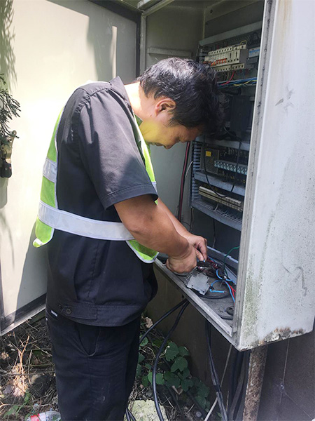 圖為修復(fù)后的隧道口路燈 對(duì)于修復(fù)被盜電纜,一般最直接的做法是重新再拉一根新電纜至配電箱,利用箱內(nèi)現(xiàn)成的控制開關(guān)和交流接觸器等元器件,完成整個(gè)電纜連接工作,但中心隊(duì)員考慮到此種方法不僅工作量大,修復(fù)成本高,而且存在再次被盜的可能性,如果用鋁線代替,電力傳輸又要大打折扣。于是,他們另辟蹊徑,計(jì)劃從剩余配電箱至路燈還有200余米未被盜取的電纜中截取一段,直接和洞口情報(bào)板電纜相接,這樣既能節(jié)省人力、物力,又能以最快速度恢復(fù)路燈正常工作。 當(dāng)天一早,中心隊(duì)員帶上相應(yīng)的工具和設(shè)備直奔現(xiàn)場(chǎng),在確認(rèn)電纜位置及走向后,便著手抽離洞內(nèi)電纜??紤]到洞口到配電箱電纜至少有100余米,電纜溝下面又鋪有其他眾多電纜以及之前掉落的垃圾,直接從洞口抽離根本無法動(dòng)彈。于是,中心4名隊(duì)員便每隔10米左右用撬棍撬開上面水泥蓋板,整個(gè)人跳進(jìn)電纜溝內(nèi),彎著腰一段一段抽離。抽到最后一個(gè)溝時(shí),4人頂著烈日,齊力把重達(dá)近百斤電纜抽離整個(gè)電纜溝并放置在護(hù)欄內(nèi)側(cè)草地上,隨后再從抽出的這段電纜中剪取適當(dāng)長(zhǎng)度,重新鋪設(shè)后與寧向出洞口的情報(bào)板電纜相接。 臨近中午,戶外溫度不斷升高,中心隊(duì)員早已濕透衣背,為趕在一天中最熱的時(shí)間點(diǎn)前完成任務(wù),4名隊(duì)員臨近解決午餐又迅速奔赴現(xiàn)場(chǎng),拆除原配電箱內(nèi)的舊器件,將其用回到新的供電線路中,而多余的器件則捆綁打包帶回中心以留備用,節(jié)省公司后期維養(yǎng)成本。 下午1:40,經(jīng)過通電測(cè)試,9盞路燈全部恢復(fù)正常工作。集團(tuán)總工程師江輝在工程部微信群里肯定了中心工作,并提醒一線人員切記做好防暑降溫工作,注意自身身體狀況。