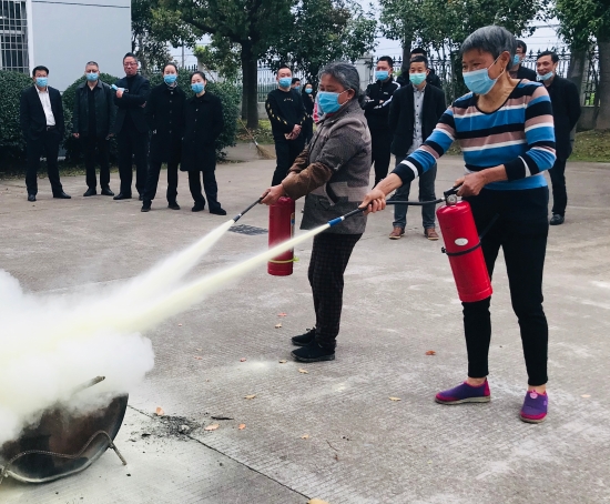 圖為使用滅火器演練 隨后,該所開展滅火器使用模擬演練。在演練中,大家利用平時(shí)更換下來的舊滅火器,依次輪流進(jìn)行操作,更有一些員工主動(dòng)熱心幫助保潔阿姨們講解如何正確使用滅火器,以身示范正確操作方式及每一個(gè)分解動(dòng)作要領(lǐng)。