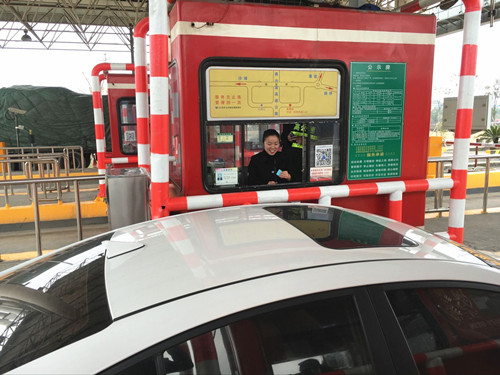 圖為工作人員在收費(fèi)站外廣場引導(dǎo)車輛有序通行