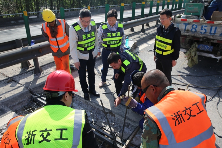 隨后,在伸縮縫型鋼安裝現(xiàn)場,陳文波撿起鑿除的碎渣,查看被鑿除的舊伸縮縫情況。公司所轄路段屬于軟土路基,且有91座橋梁,由于運行時間已20余年,部分橋梁伸縮縫破損較為嚴重,如何維修橋梁伸縮縫和橋頭跳一直是個老大難問題。在橋梁伸縮縫修補現(xiàn)場,因為重車的碾壓,部分伸縮縫已經(jīng)磨損嚴重,所在的混凝土路面只能借助鑿巖機進行作業(yè)。