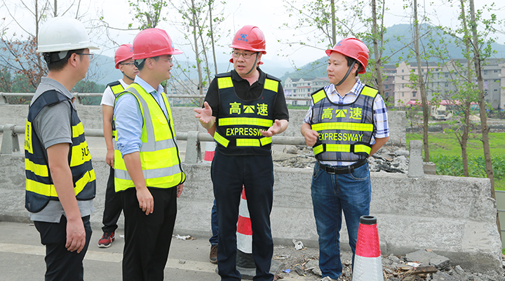 圖為陳文波在溫嶺西收費(fèi)站匝道橋梁維修工程現(xiàn)場(chǎng)了解情況