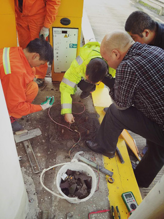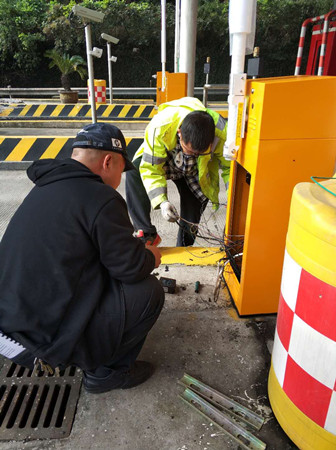 圖為工作人員對(duì)新欄桿機(jī)進(jìn)行接線(xiàn)