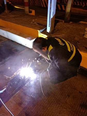 到了現(xiàn)場,隊員發(fā)現(xiàn)該車道輪檢器鐵板螺孔由于不斷摩擦并逐漸變大,導(dǎo)致整顆螺栓脫離底下固定螺座,加之當(dāng)天是春節(jié)高速免費第一天,車輛經(jīng)過時車速都較快,直接將整塊鐵板帶離底座。如果不及時對鐵板進行加工恢復(fù),不僅不能保護下面的輪檢器,而且還有可能造成車輛爆胎??沙σ谷考庸S都已關(guān)門,如果讓廠家發(fā)貨至少也要好幾天。正在兩難之際,中心副經(jīng)理葉俊想到將鐵板與底座邊緣直接焊死的臨時應(yīng)急方法,待節(jié)后再向廠家定制或重新購買。 方案有了,大家兵分兩組,一組去中心倉庫拿電焊機、電焊條等設(shè)備,一組待在原地清理鐵底下方於泥等雜物,為隨后的電焊工作做準備。設(shè)備到位后,葉俊一手操起電焊罩,一手熟練的將電焊條點在了鐵板與底座邊緣之間,經(jīng)過近一個小時的處理,輪檢鐵板與地面底座牢牢地固定在一起,再也不用被飛馳而過的車輛帶離。 項寅曉