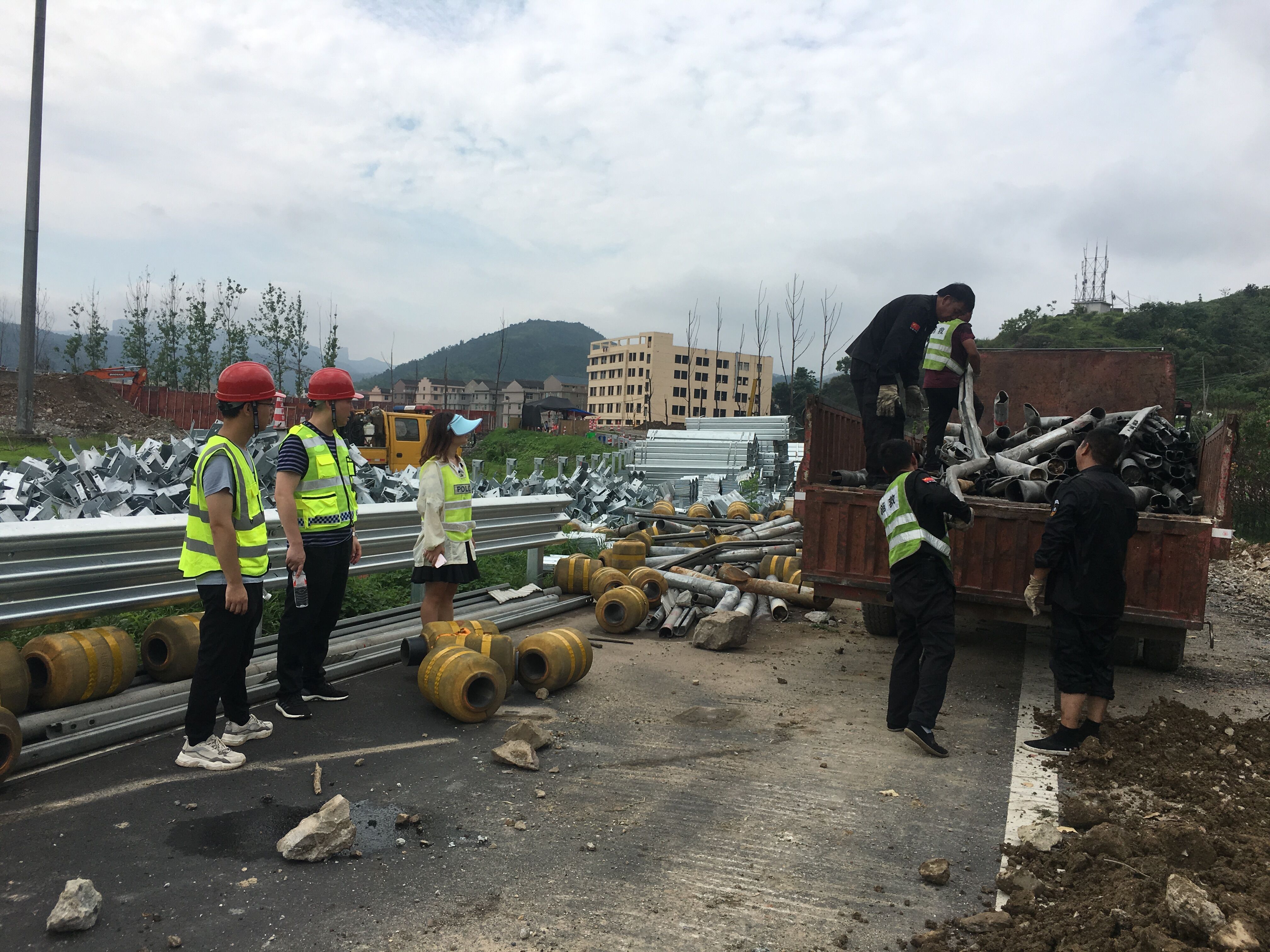 圖為廢舊物資處置現(xiàn)場(chǎng) 一大早,小組成員直接抵達(dá)事故現(xiàn)場(chǎng),戴上安全帽、穿上反光背心,伴隨著“轟隆隆”的打樁聲,大家穿過(guò)臨時(shí)為高架橋斷層搭建的鐵梯,從布滿碎石的緩坡爬上施工區(qū)。此時(shí)挖掘機(jī)、裝載機(jī)等不停作業(yè),現(xiàn)場(chǎng)灰塵彌漫,環(huán)境惡劣,大家冒著酷暑一直守在現(xiàn)場(chǎng)監(jiān)督,對(duì)廢舊物資進(jìn)行分類(lèi),逐一清點(diǎn),嚴(yán)把廢舊物資處置關(guān)。