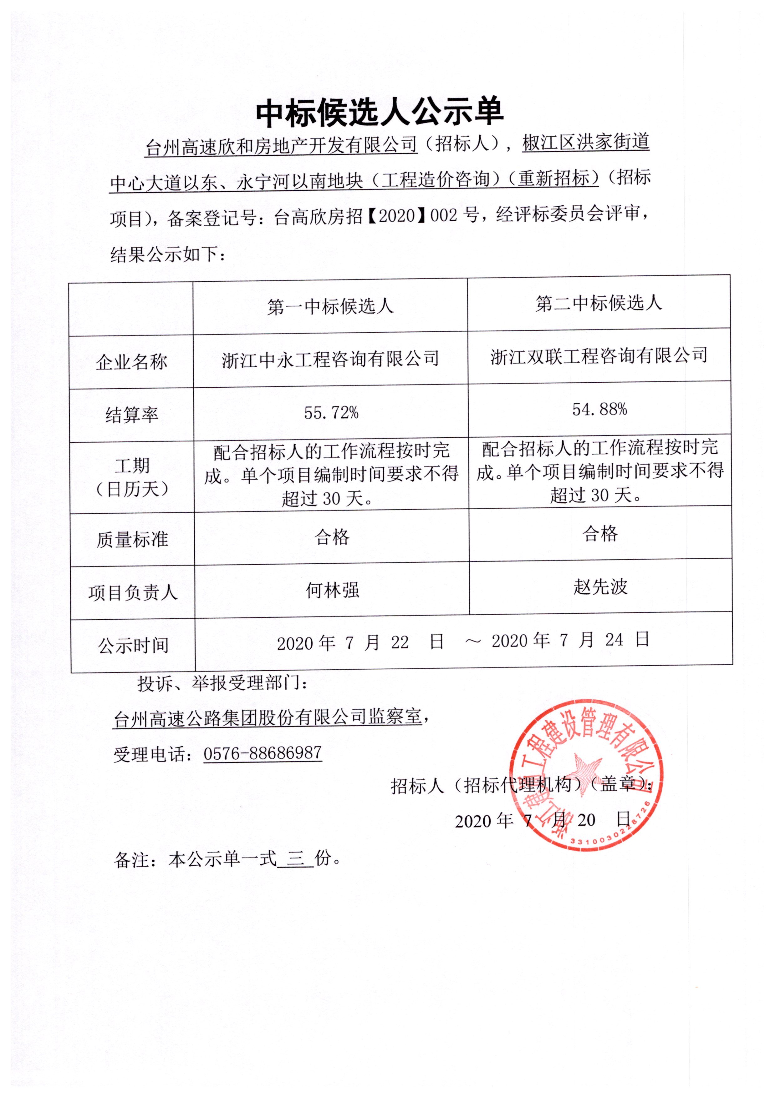 椒江區(qū)洪家街道中心大道以東、永寧河以南地塊(工程造價(jià)咨詢)中標(biāo)候選人公示單